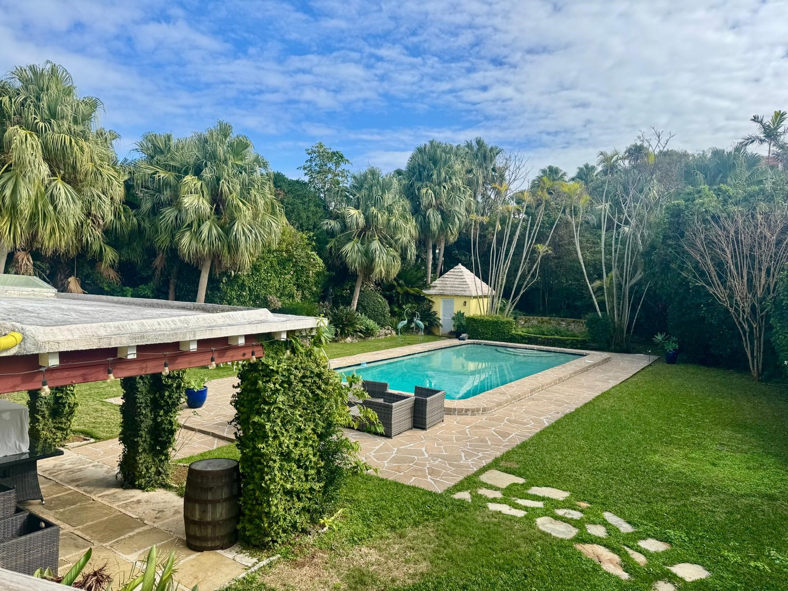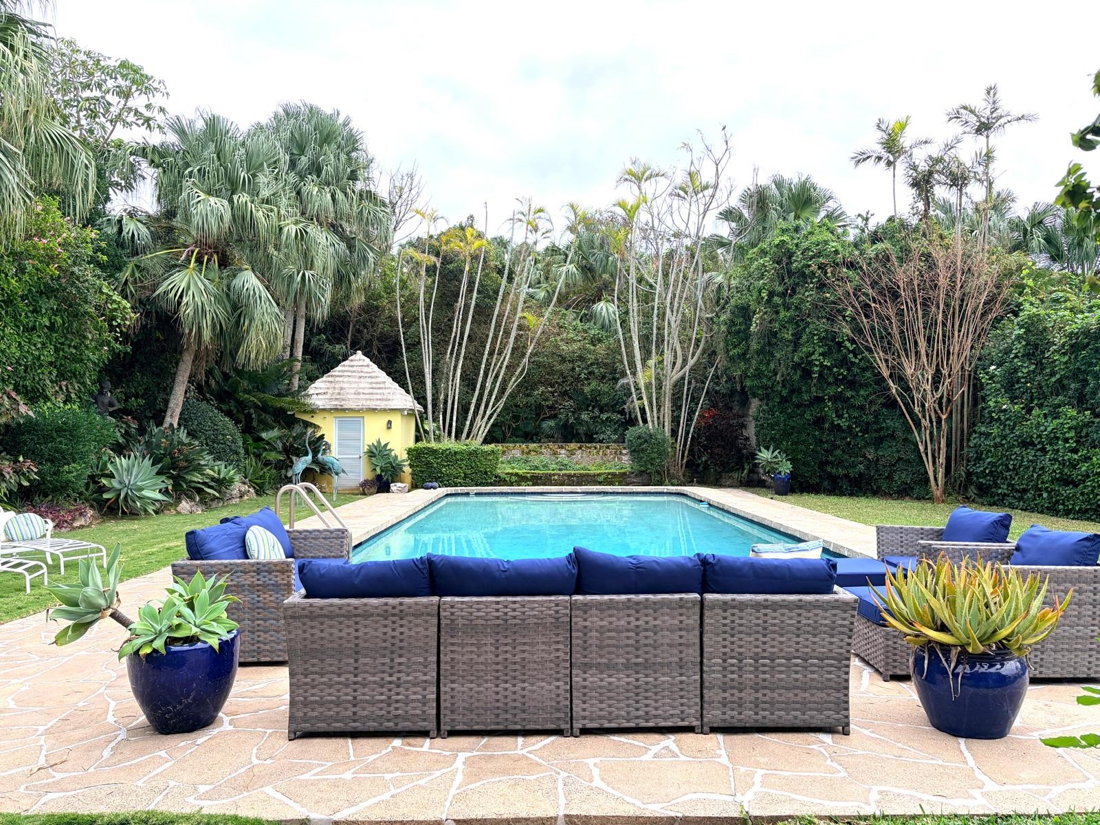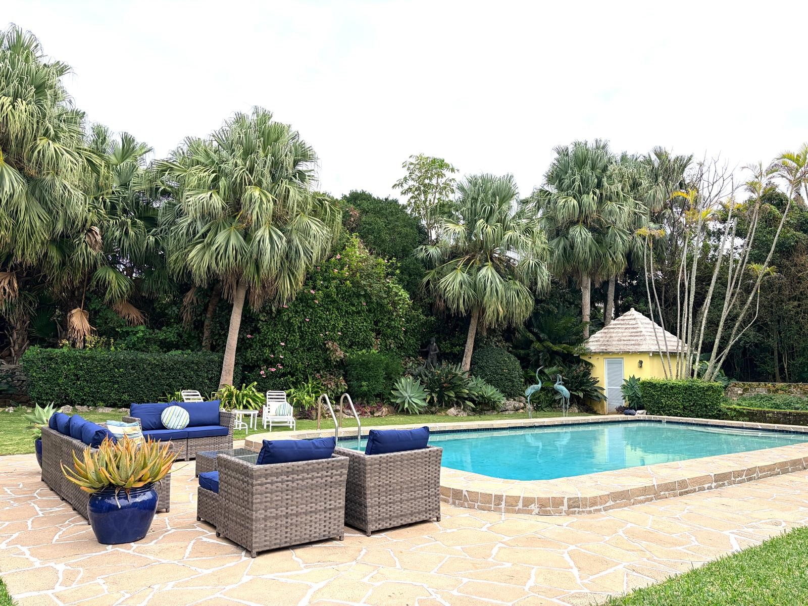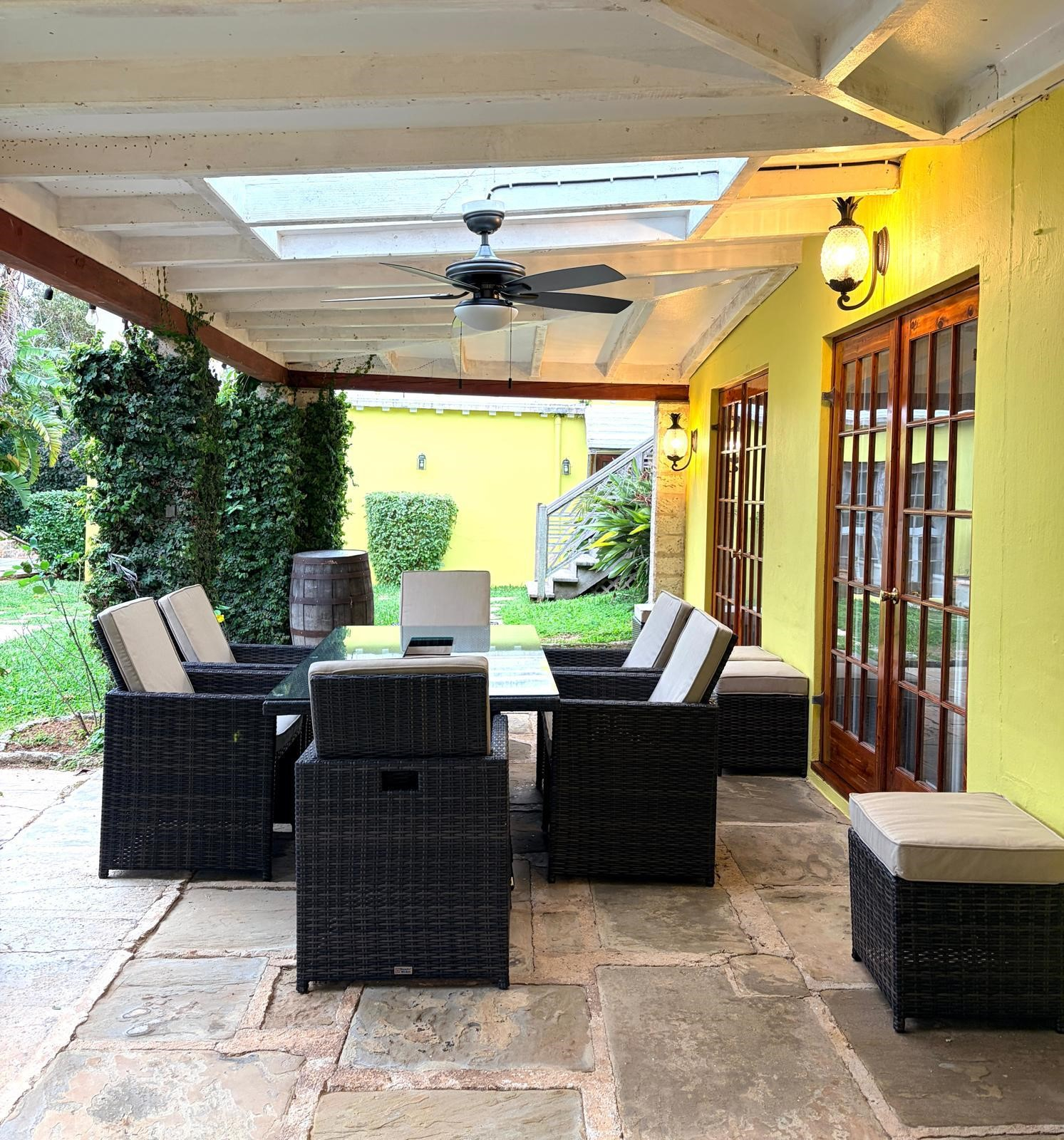 Backgammon is an impressive, centrally located Bermuda home whose stunning pool area and lush gardens create an immediate wow factor. While the beautifully landscaped outdoor spaces will tempt you to spend every moment poolside, the newly renovated interior is equally inviting and effortlessly draws you in. Modern, warm, and filled with intriguing artistic touches by the owner, this home truly feels like a “home away from home.” The entry hall opens into a welcoming living area where guests can relax, curl up with a good book, or enjoy the grand piano—which, intriguingly, can also play itself. From here, doors lead to a balcony and steps down to the pool and garden level, making indoor-outdoor living seamless. Whether you’re planning an evening of entertaining or simply enjoying the sound of children playing in the garden, this level invites you to slow down and savor the setting. There is even a delightful secret garden waiting to be discovered. Just steps down from the living room is the brand-new designer kitchen, completed in 2026 by renowned architects. Featuring a center island and every modern convenience, this colourful space is ideal for family gatherings. With a large-screen TV and fireplace, as well as a family-style dining space around the island. From the kitchen a wall of French doors opens to a covered patio—perfect for outdoor conversations, cocktails, and relaxed evenings. This level also includes a bathroom with shower and a utility room with washer and dryer. Backgammon comfortably accommodates family and friends with five bedrooms. From the entrance level, steps lead down to two bedrooms: The primary suite features a king bed, TV, en-suite bath, and direct access to the garden and pool—ideal for a midnight swim. A second king bedroom, also en-suite, opens onto the lush gardens through French doors. On the entrance level, you’ll find a third king bedroom with TV and en-suite bath. Nearby are the fourth and fifth bedrooms, each with queen beds, sharing a Jack-and-Jill bathroom. The home is within easy walking distance of the Darrell’s Wharf ferry stop, offering direct access to Hamilton, as well as the Middle Road bus stops being nearby. The renowned Four Ways Inn restaurant is also within walking distance. This exceptional home is newly offered for summer 2026,an ideal opportunity to create lasting memories of swimming, dining, music, and entertaining with friends and family. Only 5 minutes by cab to Elbow Beach and Coral Beach Club. Guests will enjoy complete privacy and a peaceful setting. While there is a separate apartment on the property with its own private walkway and parking that may be occupied by the owner, guest areas remain entirely private. For bookings, please contact [email protected].